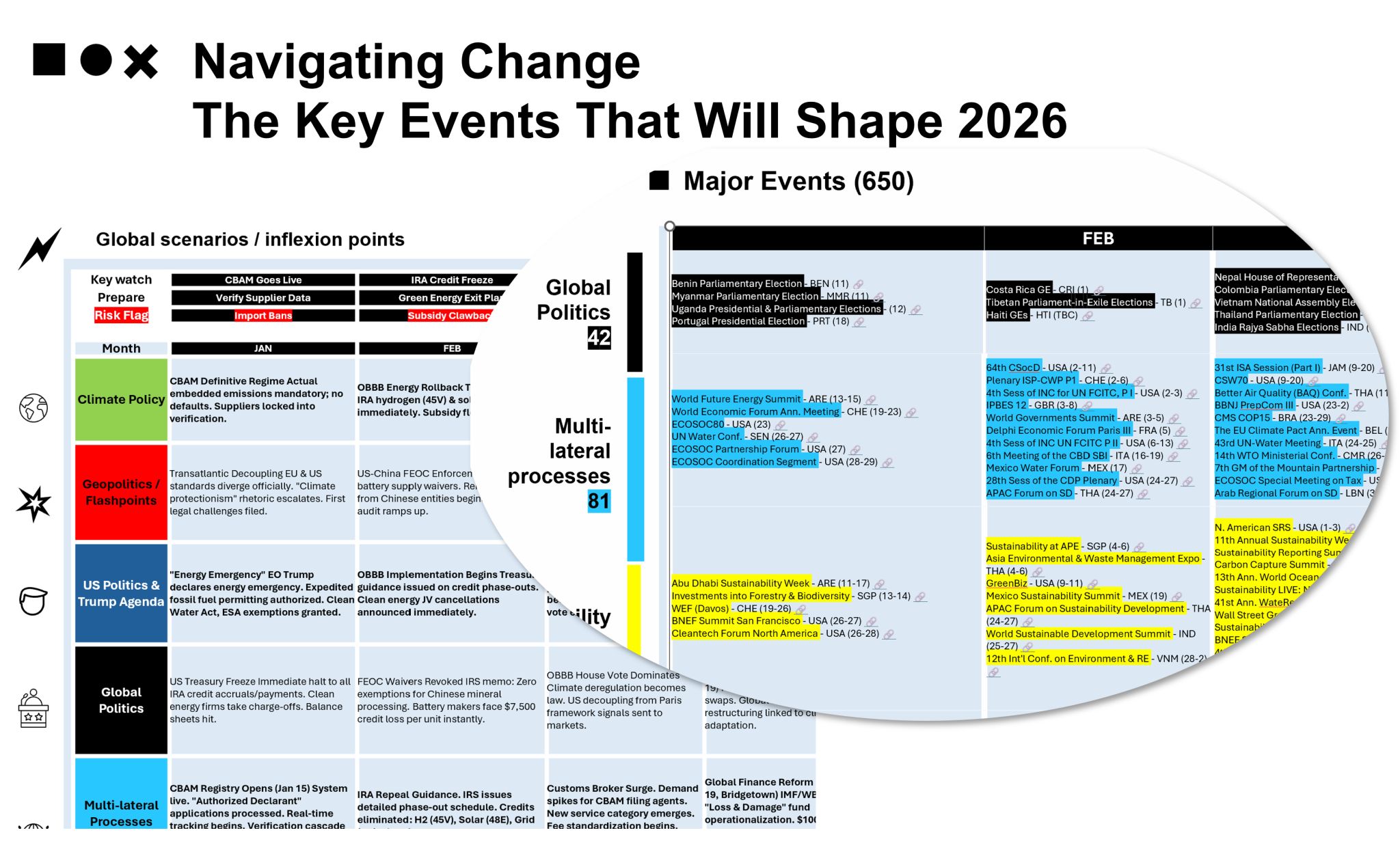 We mapped the tightly packed 2026 event calendar - climate summits, regional forums, key business events - with an overlay of the likely geopolitical flashpoints to prepare for.