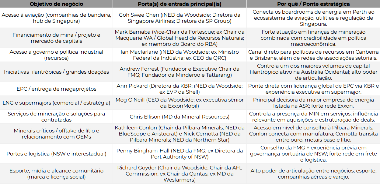 Pontuação de “graus”: contabilizamos os diferentes setores em que cada pessoa atua atualmente (ou atuou muito recentemente) e atribuímos peso adicional a posições de alta alavancagem (chair/CEO, principais conselhos da ASX, órgãos públicos de topo) e participações acionárias relevantes.